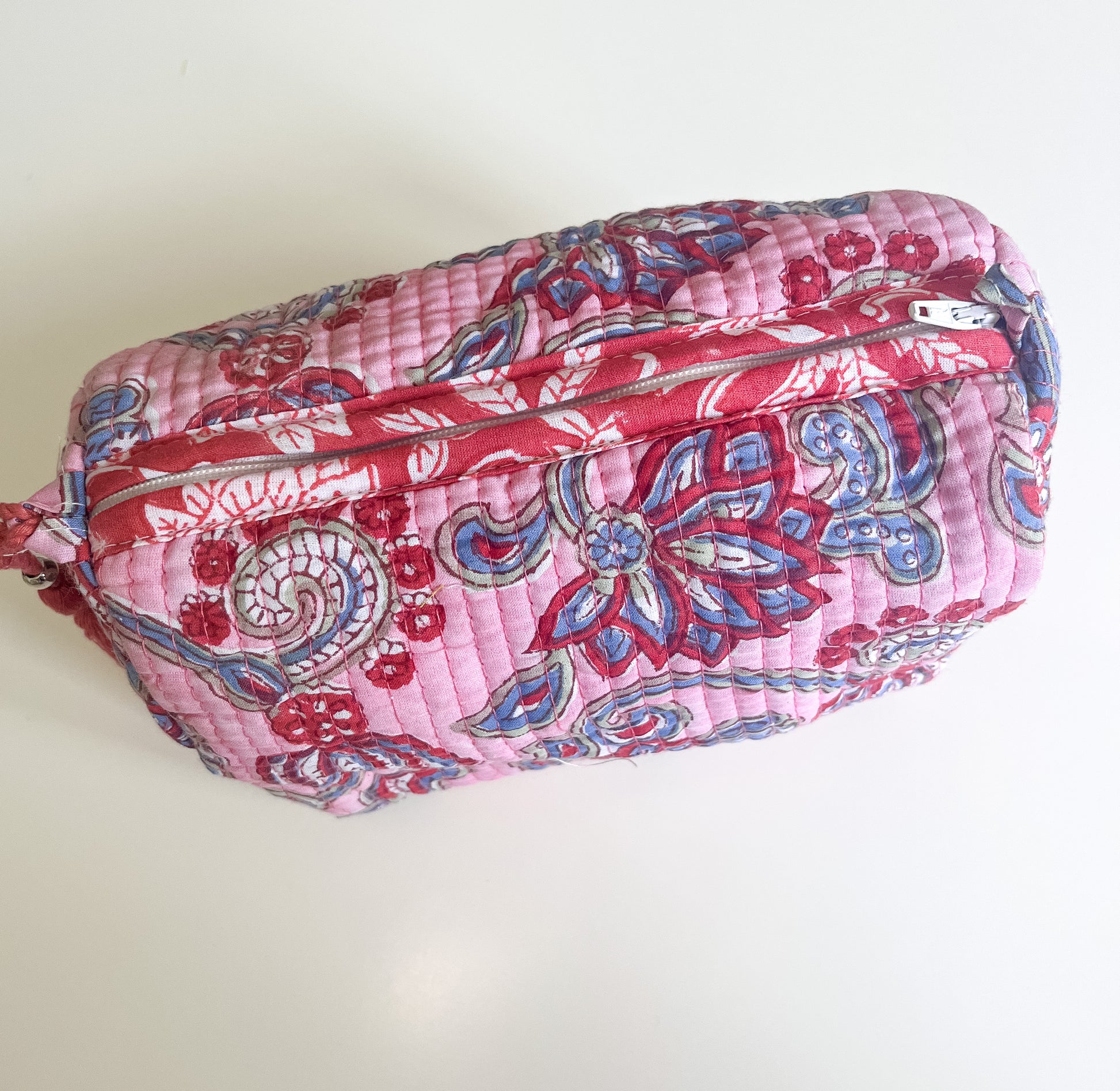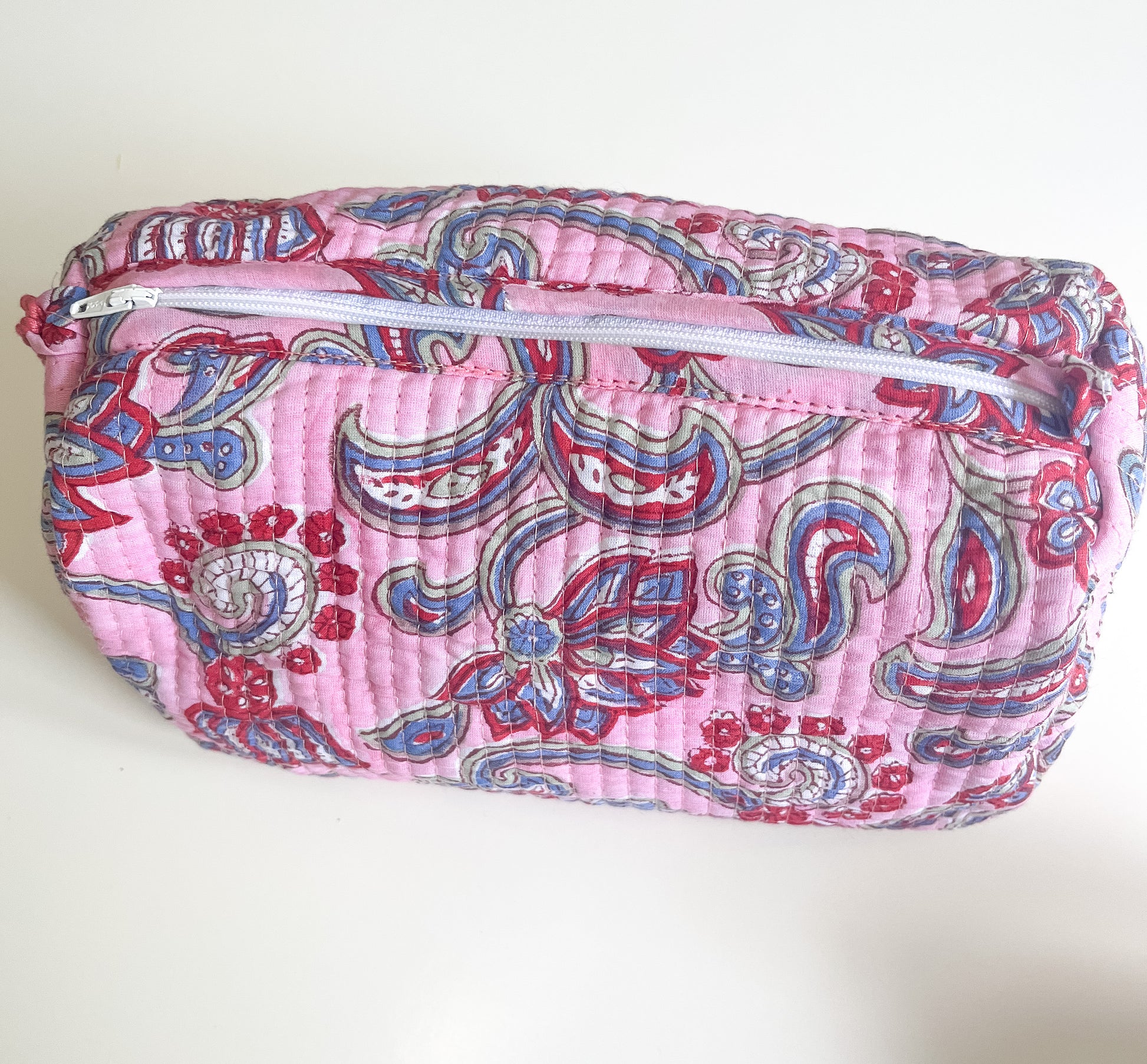 Cosmetic bags designed with handmade block print fabric. Each bag is lined with a zipper and coordinating tassel.